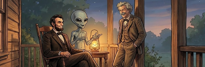 How about a little satirical humor to start the new year? The video takes place in the quiet mountains of Kentucky, where two time travelers from the 19th century are relaxing on the porch of a mountain cabin. The peaceful evening is interrupted when a silver craft lands nearby, and a gray extraterrestrial visitor arrives….